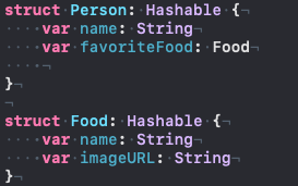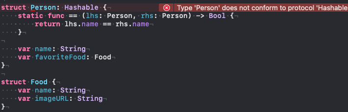 위의 구조 (첫번째 사진) 에서 Food가 Hashable하지 않기 때문에 Person에 == 연산자 함수를 구현해도 오류가 남